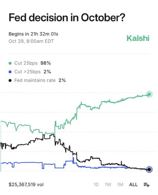 Fed Countdown: 98% Odds of a 25 bps Cut Tomorrow Posted on October 28, 2025 by http://wealthcreation.club đ Fed Countdown: 98% Odds of a 25 bps Cut TomorrowRead More: tinyurl.com/maxch4pn#FedDecision #MarketWatch #InterestRates #Investing #Finance #Powell #Macroeconomics #TradingInsights #LiquidityCycle Share this: Click to share on X (Opens in new window) X Click to share on Facebook (Opens in new window) Facebook Like Loading... Published by http://wealthcreation.club http://wealthcreation.clubâWe are educating regular people about how to be able to make more money in a disciplined way View all posts by http://wealthcreation.club