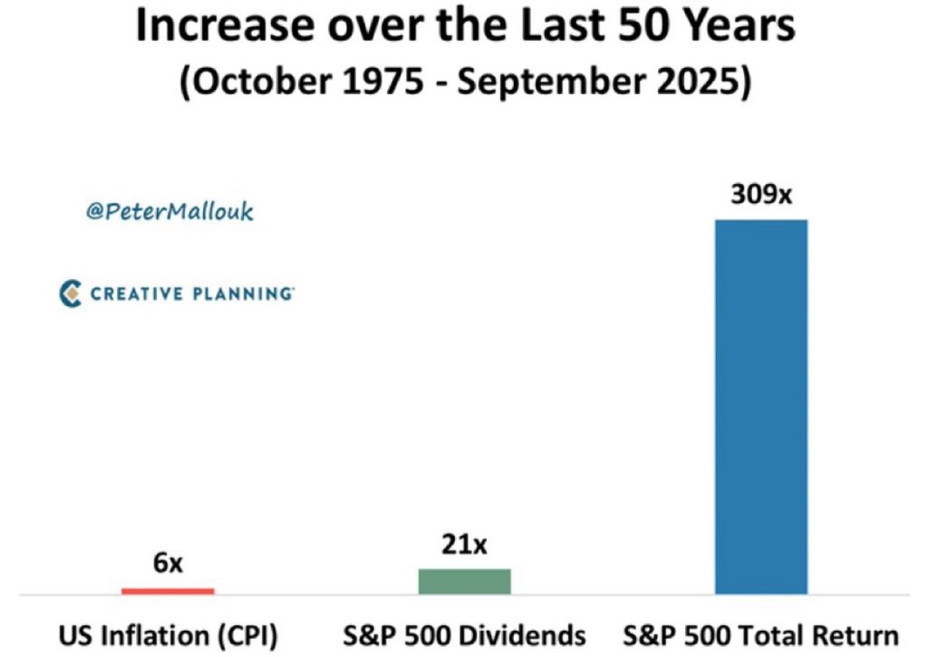 50 Years, 6x Inflation—But the S&P 500 Soared 309x Posted on November 14, 2025 by http://wealthcreation.club 🚀 Over 50 years, US inflation rose 6x—but S&P 500 total returns skyrocketed 309xRead More: bit.ly/Stocks-Conquer-Inflation#FinanceMasterclass #InstitutionalInvesting #WealthCreation #InflationProtection #50YearReturns #DividendGrowth #S&P500 #AssetAllocation #PortfolioDesign #LongTermInvesting #EquityEdge Share this: Click to share on X (Opens in new window) X Click to share on Facebook (Opens in new window) Facebook Like Loading... Published by http://wealthcreation.club http://wealthcreation.club—We are educating regular people about how to be able to make more money in a disciplined way View all posts by http://wealthcreation.club