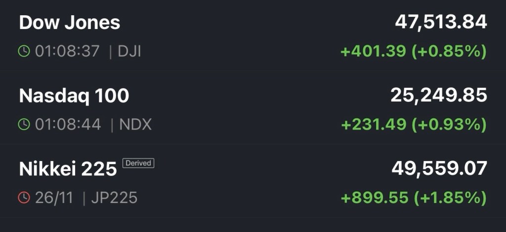 Wall Street’s “Thanksgiving Rally” Extends as Rate‑Cut Bets Surge November 27, 2025 http://wealthcreation.clubLeave a comment 🦃 Wall Street’s “Thanksgiving Rally” Extends as Rate‑Cut Bets Surge — Hedge Funds Go Risk‑OnRead More: bit.ly/Thanksgiving-Rally#Markets #Investing #SP500 #Macroeconomics #InterestRates #AI #HedgeFunds #Equities #AlphaBinwaniCapital #Fed #Earnings #MarketStrategy