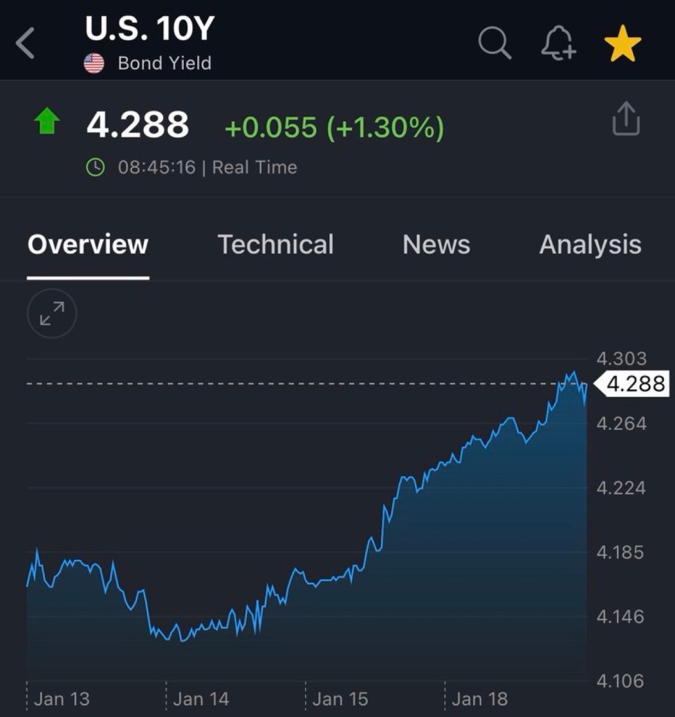 10Y Treasury Yield Breaks 4.30% — First Time Since September Posted on January 20, 2026 by http://wealthcreation.club 📈 10Y Treasury Yield Breaks 4.30% — First Time Since SeptemberRead More: tinyurl.com/bdds7rkt#Bonds #Macro #10YN #USTreasuries #Yields #Markets #Investing #FixedIncome #FOMC #Trump #Tariffs #Rates #Inflation #GlobalMacro #Trading #InstitutionalInvesting #InterestRates Share this: Share on X (Opens in new window) X Share on Facebook (Opens in new window) Facebook Like Loading... Published by http://wealthcreation.club http://wealthcreation.club—We are educating regular people about how to be able to make more money in a disciplined way View all posts by http://wealthcreation.club