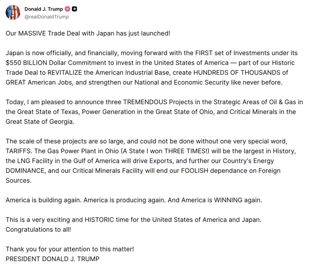 U.S.-Japan Trade Pact Sealed Posted on February 18, 2026 by http://wealthcreation.club 🚨 BREAKING — U.S.-Japan Trade Pact SealedRead More: tinyurl.com/4mb4ftcb#USJapanTradePact #USJapanDeal #TradeAgreement #BilateralTrade #TrumpAdministration #Tariffs Share this: Share on X (Opens in new window) X Share on Facebook (Opens in new window) Facebook Like Loading... Published by http://wealthcreation.club http://wealthcreation.club—We are educating regular people about how to be able to make more money in a disciplined way View all posts by http://wealthcreation.club