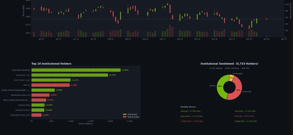 💥 The Big 3 passive index giants (Vanguard, BlackRock, State Street) are all adding to NVDA — a structurally bullish signal as passive AUM growth anchors the float. The active managers JPMorgan (-6.65%) and T. Rowe (-5.70%) trimmed meaningfully, suggesting valuation discomfort at current levels