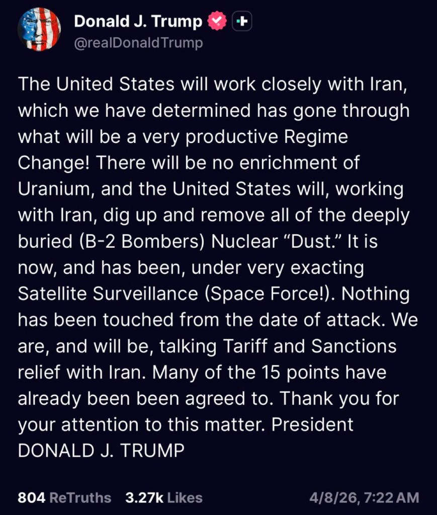 Trump Vows to Strip Iran of ‘Nuclear Dust’ in Zero-Enrichment Push Posted on April 8, 2026 by http://wealthcreation.club BREAKING: President Trump says Iran will have “no enrichment of Uranium” and the US will be working with Iran to “dip up and remove” all of Iran’s “nuclear dust.”Trump also says the US is discussing tariff and sanction relief with Iran. Share this: Share on X (Opens in new window) X Share on Facebook (Opens in new window) Facebook Like Loading... Published by http://wealthcreation.club http://wealthcreation.club—We are educating regular people about how to be able to make more money in a disciplined way View all posts by http://wealthcreation.club