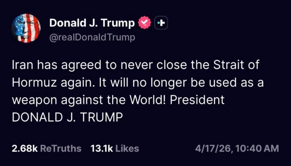 Iran Pledges to Keep Strait of Hormuz Open — Forever Posted on April 17, 2026 by http://wealthcreation.club ‼️ 🇺🇸 🇮🇷 BREAKING: President Trump says Iran has agreed to never close the Strait of Hormuz again. Share this: Share on X (Opens in new window) X Share on Facebook (Opens in new window) Facebook Like Loading... Published by http://wealthcreation.club http://wealthcreation.club—We are educating regular people about how to be able to make more money in a disciplined way View all posts by http://wealthcreation.club