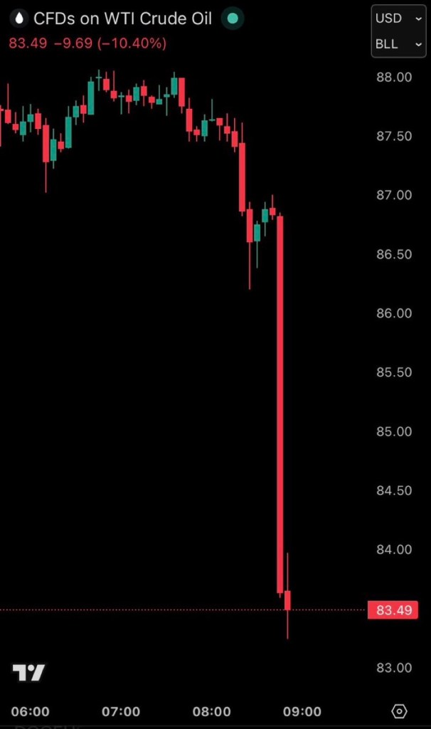 US oil prices crash to $83/barrel Posted on April 17, 2026 by http://wealthcreation.club ‼️ BREAKING: US oil prices crash to $83/barrel as Iran officially reopens the Strait of Hormuz for the remainder of the ceasefire. Share this: Share on X (Opens in new window) X Share on Facebook (Opens in new window) Facebook Like Loading... Published by http://wealthcreation.club http://wealthcreation.club—We are educating regular people about how to be able to make more money in a disciplined way View all posts by http://wealthcreation.club