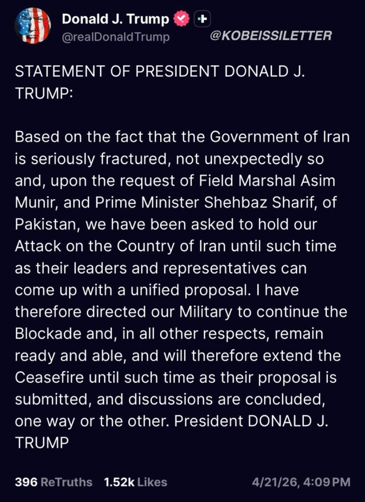 Trump Extends Ceasefire Indefinitely Posted on April 22, 2026 by http://wealthcreation.club BREAKING: President Trump extends the US ceasefire with Iran indefinitely. Share this: Share on X (Opens in new window) X Share on Facebook (Opens in new window) Facebook Like Loading... Published by http://wealthcreation.club http://wealthcreation.club—We are educating regular people about how to be able to make more money in a disciplined way View all posts by http://wealthcreation.club